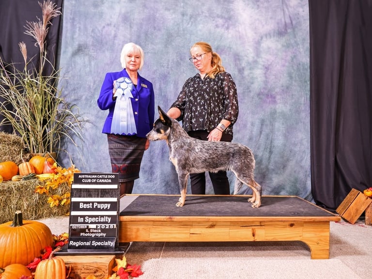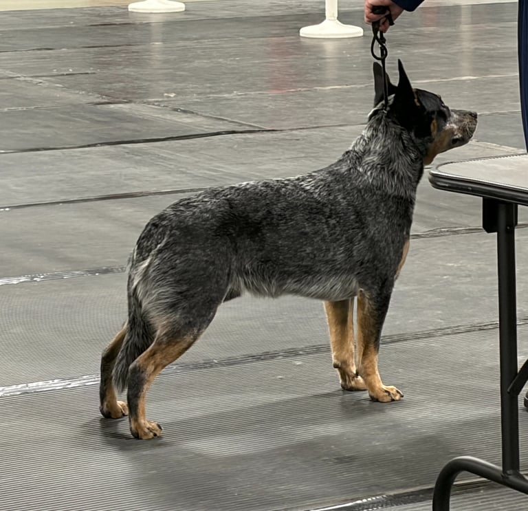 This handsome young man is a puppy back from Halcyon Australian Cattle Dogs out of WNR's Frankly Speaking and Van Haley Briarmoor Book Of Spells. He is co-owned with Richland Australian Cattle Dogs (Where he resides) and Halcyon Australian Cattle Dogs. We're excited to watch this boy and see what he gets up to. Smoke is off to a great start with his show career, his first time at a show Smoke took home 2 Best Baby Puppy in Groups and at his first Regional Specialty show Smoke takes Best Puppy.
